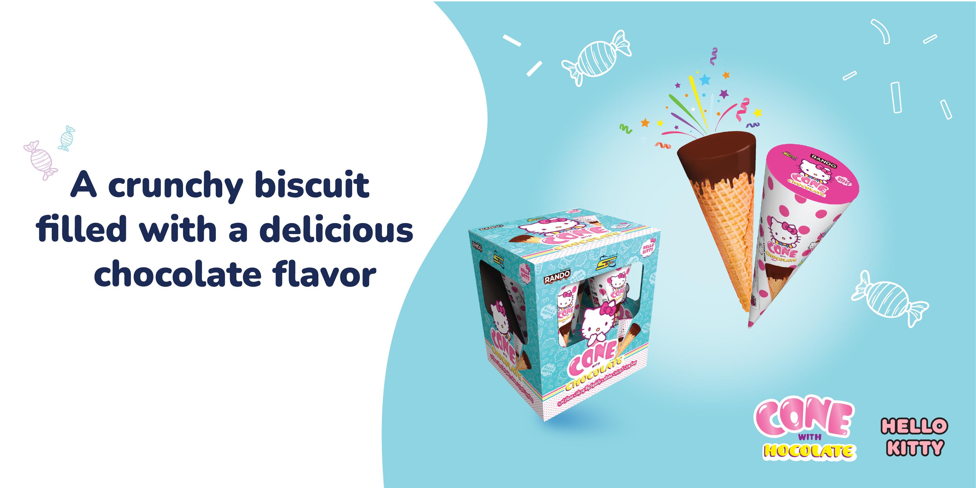 Chocolate Cornet topped with sweets sprinkles, colorful is delicious Milk Chocolate: (Sugar, Cocoa Butter, Non-Hydrogenated Vegetable Oil (Palm Oil), Whey Powder and Skim Milk Powder and Whole Milk Powder (Contains Lactose), Cocoa Powder, Cocoa Mass, Emulsifier (Soya Lecithin E322i), Natural Identical Flavoring (Vanillin). Biscuits: (Wheat Flour and Wheat Starch (contains gluten), Sugar, Non-Hydrogenated Vegetable Oil(Palm Oil), Salt, Leavening Agents(Ammonium Carbonate ES03i, Sodium Carbonate E500i, Sodium Acid Pyrophosphate E450), Gluten, Thickener (Carboxymethyl Cellulose E466), Em+E5ulsifier(Sunflower Lecithin E322i), Preservative (Sodium Met bisulfite E223)) us